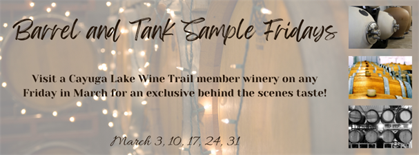 On every Friday in March, the member wineries of the Cayuga Lake Wine Trail will be offering you a tank or barrel sample to go along with the purchase of your flight or tasting.